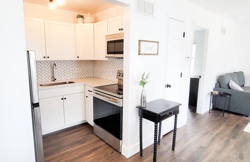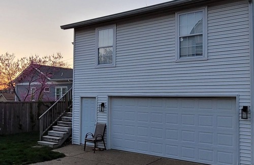Welcome to our guest house! This 1 bedroom 1 bathroom living space is completely private and ready for your stay. It is equipped with a private balcony, full kitchen, dining area, living room, one bedroom with King bed, and one bathroom. The unit is located above our garage in the back of our property. There is also a patio area with chairs and a firepit that is open for use. Street parking is readily available. It's roughly a 15-20 min walk to downtown Kirkwood(around 1 mile) and about a 20 min drive to downtown STL.