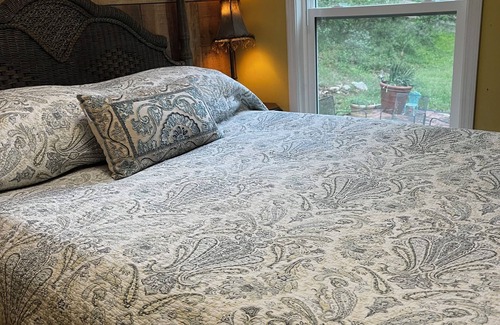 There is coffee, filters, sugar, non-dairy creamer, for a drip coffee maker. Also a microwave, gas oven/stove, full-size refrigerator, and dishwasher in the kitchen. No paper plates or plastic utensils here, you’ll have place settings for 6 with stainless steel cutlery, ceramic coffee cups, glass highball vessels, wine glasses and water glasses. Speaking of water, you’ll be drinking delicious well water from the tap. Views of nature out of every window, depending on the time of year, include blooming Dogwood trees, Japanese Maple trees, azalea, irises, roses, and much much more.