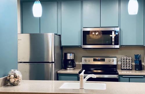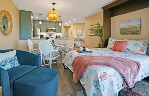 Beach lovers paradise with just steps to the sand. It's perfect for two people looking to stretch out or 4 can easily fit thanks to a wall queen murphy bed that sleeps like a normal bed. The beach decor with an electric fireplace adds to the magical ambiance our home embraces.