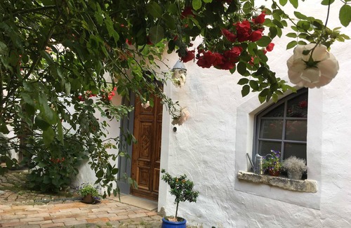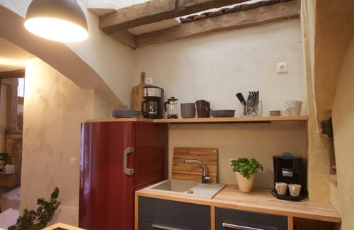 The RenaissanceStube is a double room with a modern bathroom in a refurbished building from the 16th century. Century. Original murals from the Renaissance period, a painted wooden beamed ceiling and historic plank flooring offer a very special feeling of living. Enjoy the flair of bygone times with modern sleeping and living comfort. The Mediterranean-style courtyard offers comfortable seating. A small kitchen can be shared with the guests of another room.