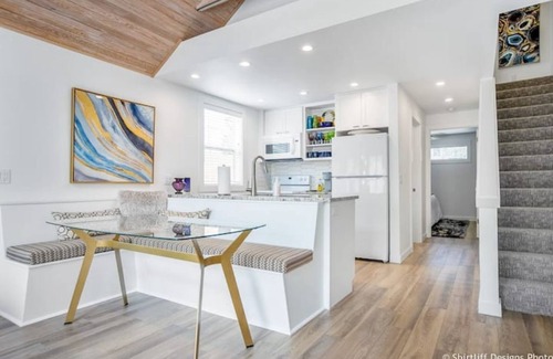 Newly renovated, King bed downstairs and Queen up stairs, each with their own bath. Well appointed and has a washer/dryer. Off street parking.