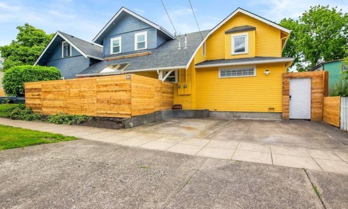 Upscale 2 bedroom, 2 bathroom space (the yellow side) or combine with the other unit and have all 5 bedrooms and 5 full bathrooms. This is a cozy and clean space just 1 block from Matthew Knight Arena and 3 blocks from Hayward Field. 2 parking spaces. Early check in may be available for events.
