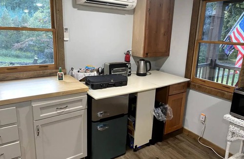 Entering the cabin through the front porch, you will find a family room/dining area with kitchenette, which as a microwave, small fridge/freezer, toaster oven, toaster, coffee machine, electric teapot and two-burner portable cooktop.