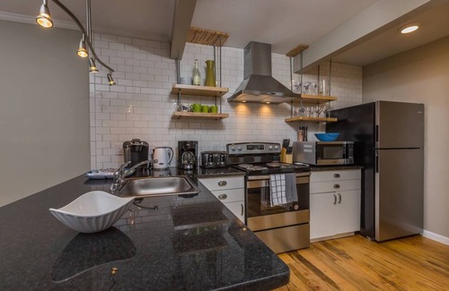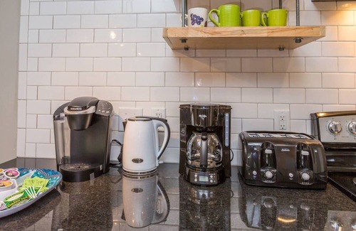 You will appreciate tasteful touches throughout the home that make this an extra special getaway- including hardwood floors and granite countertops. This home also has its own laundry room and bathroom, as well as a sofa bed that fits two comfortably. Everything you might need to feel comfortable are at your disposal, including fresh towels and sheets, cozy blankets, a sound machine, laundry detergent, and K-Cups.