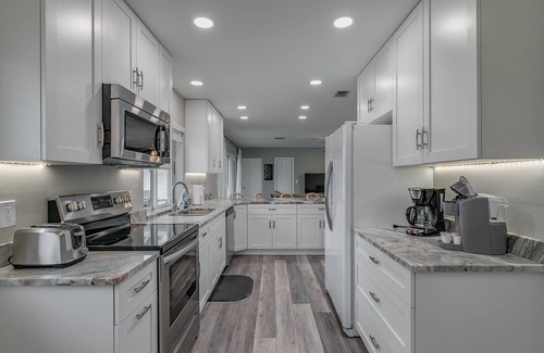 Completely Renovated Feb 2021 Gorgeous pool home with 4 bedrooms, 3 New bathrooms, New kitchen with granite, breakfast nook, breakfast bar, open to dining and living. All living areas overlook the pool (can be heated) & private back yard. Huge game room with sofa, TV, ping pong table and 2 twins. Fully stocked vacation house with extra soft sheets & luxury towels.