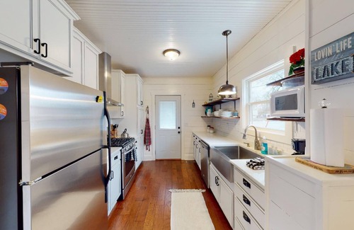 The ground floor includes a large covered front porch, one bedroom (King) and bathroom with walk in tile shower. The kitchen has ample counter space and a huge farmhouse sink. The second floor has 3 bedrooms (2 Queen and 2 full beds) along with a bathroom and laundry.
