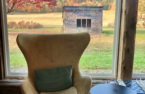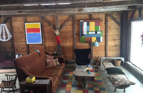 Post and beam barn with concrete radiant floor, converted to great entertaining space with pull out King bed and bathroom with shower. A unique space for one couple or entertainment space for gatherings, get togethers, and receptions. The 500 sqft great room has massive windows that let in natural light and provide views across the property. There is a kitchenette with a cook top, but no oven. This property can be rented with the attached 4 bedroom farm house, or separately for two people.