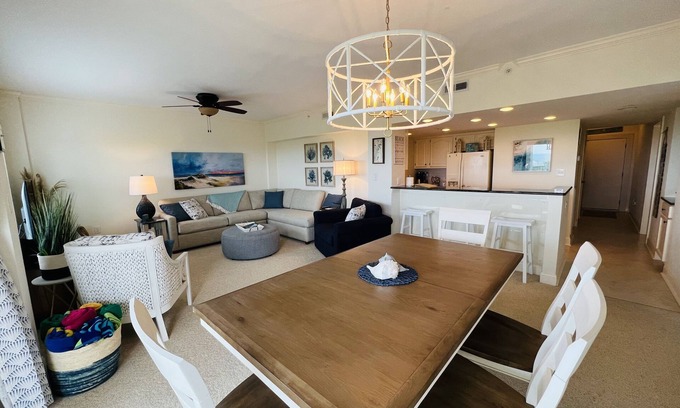 3BD/2BA condo with deck overlooking WB. Newly furnished with spacious living, large dining, bar seating. Full kitchen, washer/dryer in unit. Open living/dining/kitchen floorplan has terrific views of ocean, beach and dunes. Comfy sectional, 55” TV, oversized chair and additional seating. Farmhouse table with chair and bench seating. Built-in, lighted bar. Amazing deck to catch the ocean breeze on contains pub table with four chairs and two swivel captain chairs ideal for relaxing. Primary bedroom features king bed, large walk-in closet and private bath with tiled shower, granite countertop and linen pantry. Spacious secondary rooms, one with queen bed. Bunk bedroom has twin on top, double mattress on bottom with double mattress trundle bed, sleeps up to 5 comfortably. Hall bathroom also has walk-in tile shower, granite countertop and ample lighting. Ceiling fans in all bedrooms and living room. Covered parking for 2 cars. Elevator, secured entry, community pool, private beach access and tennis court. Fantastic access to Shell Island, The Loop, dining, shopping and more!