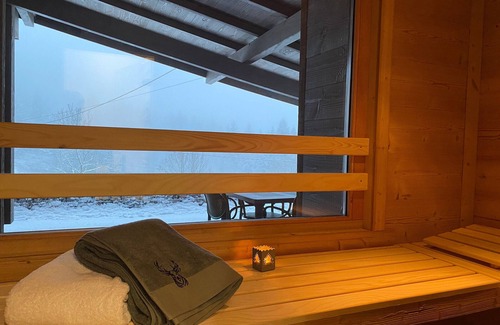 As soon as you arrive, you will be greeted by breathtaking views of the surrounding forest, creating a calming atmosphere. The chalet has a private sauna, offering the opportunity to relax and recharge after a day of outdoor activities. Chalet, composed on the ground floor: