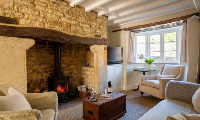 This spacious terraced cottage has a wealth of character features, including oak beams, exposed Cotswold stone walls, elm floors and an inglenook fireplace with a wood burning stove.