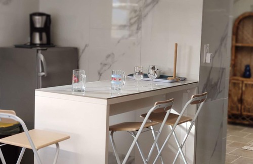 1 large living room with a new kitchen fully equipped with all appliances, refrigerator-freezer, microwave, filter and Senseo coffee makers, thermos, toaster, electric kettle, maxi plancha, raclette grill, etc. Open to the living room with 2 sofas, large wall-mounted flat-screen TV, Wi-Fi