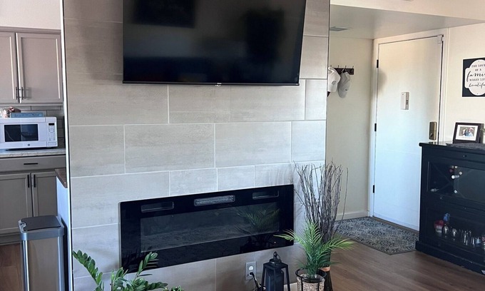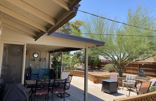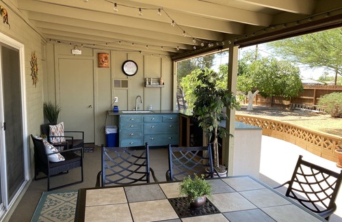 This newly updated home offers comfort and convenience in this 2 bedroom, 2 bathroom, fully furnished house including an outdoor grill area complete with BBQ and griddle, sink, and counter space to prepare your cocktails to enjoy under the covered patio. Our home has wireless internet, air conditioning, full kitchen with Keurig coffee maker, electric fireplace, laundry, and 65" T.V. This 1100 sq foot home has a separate laundry area plus outdoor living. Carpet adds comfort in the bedrooms, and the recently renovated kitchen and bathrooms add a modern feel. Enjoy the comfort of a cozy home while vacationing or working in sunny Arizona!