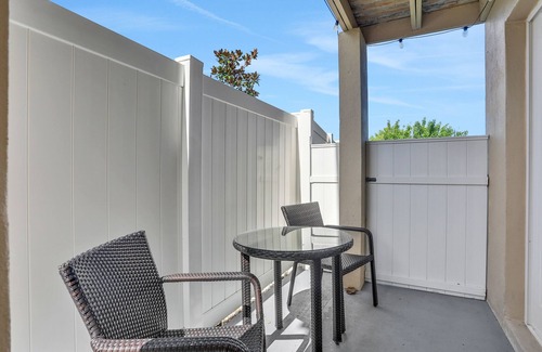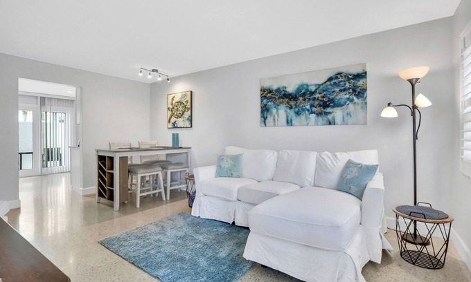 Showcasing Florida-inspired decor, the home's updated interior comes decked out in serene coastal tones and all the modern comforts of home. The full kitchen is equipped to handle anything from home meal prep to beach snacks. A plush sofa and massive smart TV set the stage for casual downtime in the living room. The private patio area offers a pleasant spot for coffee or cocktails.