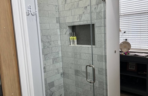 The unit is newly renovated space with king bed, wet bar area, large bathroom with washer and dryer.