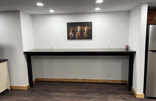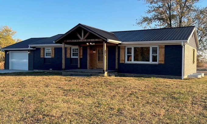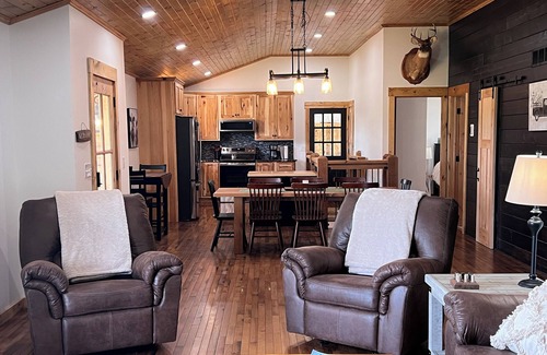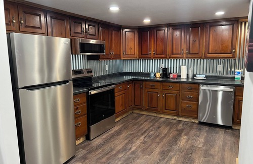 Maywood is waiting for you at this 4-bedroom house. With 1 king bed, 3 queen beds, and 3 pull out couches that are full beds, this gorgeous property offers plenty of space for guests to unwind. The 3 bathrooms come equipped with a hair dryer for added convenience. The Main floor offers all hardwood floors, open concept Kitchen, Dining, and Living Room with Main Bedroom with Private Bathroom with Soaker Tub, and Walk In Shower and dual vanities. There is a 2nd Bedroom with Semi private full bath with tub shower combo. The Lower Level offers a 2nd full kitchen, Family Room with Electric Fireplace, 2 Bedrooms with egress windows and a full bath with laundry. The home has a awesome front porch and rear stamped concrete patio. The home is located on a quiet country dead end road only 1/2 mile from the highway but extremely quiet and peaceful. Come sit on the back deck or the porch and listen to the birds or watch the sunset with a small fire in the fire pit. Home does have Fiber Internet with WIFI.