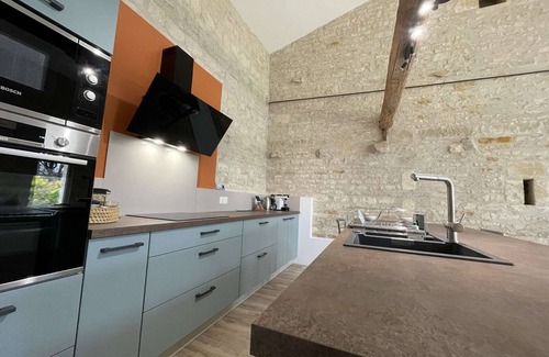 Superbe ancien corps de ferme, le charme de l'ancien refait à neuf par un architecte. Vous pourrez profiter d'une habitation individuelle de 80m2 avec une belle hauteur sous plafond, le tout refait à neuf avec le charme et l'élégance de la pierre apparente. Vous bénéficierez d'une belle pièce à vivre avec salon, salle à manger et cuisine équipée et aménagée avec lave-vaisselle et four. Une salle de bain avec lave-linge et sèche serviette. A l'étage une chambre avec un lit double en 140cm pour deux personnes et une mezzanine avec deux lits simples en 80cm chacun qu'il est possible de rassembler pour former un couchage en 160cm, une occultation avec des rideaux est possible pour un meilleur confort. Le tout sur un jardin arboré, commun avec les propriétaires. Un salon de jardin est à disposition, un bel espace pour profiter du calme, du soleil et des poules en liberté.