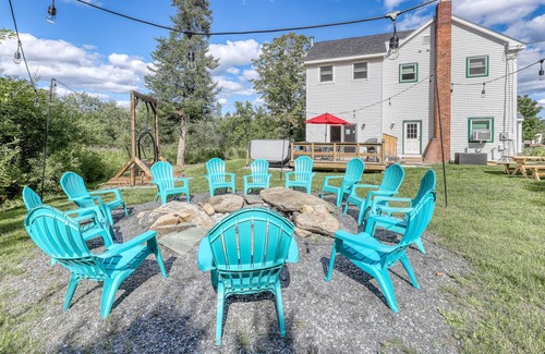 Find tranquility and peace when you choose this beautifully renovated farmhouse as your exploration base. Easily discover the beautiful mountainous scenery and a wide variety of recreation sprinkled throughout the region. Perfect for families and friends alike, this spacious 2,300-square-foot home features two living areas, large bedrooms, a private hot tub, and a deck perfect for alfresco dining with a gas grill. In the evening, gather for conversation around the large firepit and sit in the ski chair swing. Spend your days hiking, enjoying the outdoors, snowmobiling the vast trails nearby, or skiing/snowboarding at resorts such as Okemo and Killington/Pico. When the weather is warmer, choose from outdoor games, including horseshoes, cornhole, giant Jenga, and croquet. There is also a selection of board games and puzzles to enjoy next to the warmth of the pellet stove. A full kitchen provides everything you need to create delectable dishes for the group. Age-appropriate dinnerware is available for younger guests. Take in mountain views from multiple vantage points throughout the property.