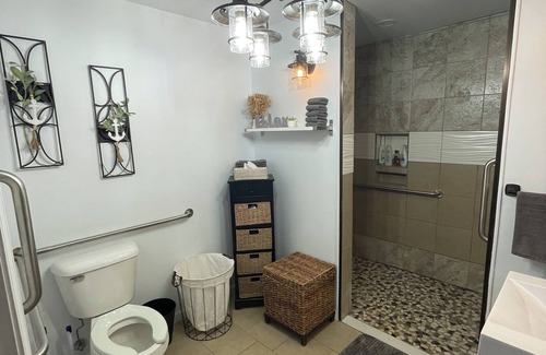 There are 2 large bathrooms (1 is handicap accessible) with amazing walk in showers! All towels & toiletries are provided.