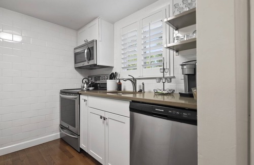 The kitchen is fully equipped with cookware, blender, mixer, coffee maker, crockpot, pizza pan, cookie sheets, waffle maker, coffees, teas and creamers, plastic wrap, aluminum foil, baggies quart and gallon.