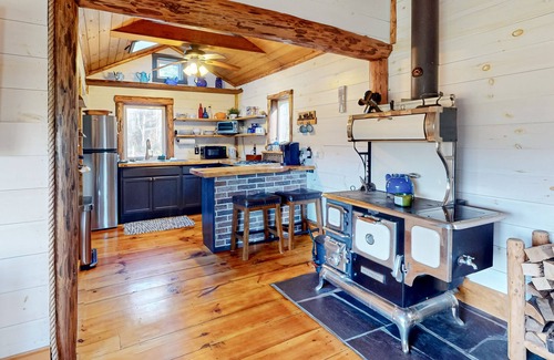 The very definition of serene, this historic Jay cabin has been completely renovated - effortlessly blending modern comfort with old-school charm. With its high ceilings, warm wood finishes, and open layout, your time spent inside is guaranteed to be cozy and comfortable. Prepare a delicious meal with the kitchen's live edge wood countertops and stainless steel appliances. When it's time to eat, gather around the breakfast bar, or dine in front of the picturesque front window, the choice is yours.