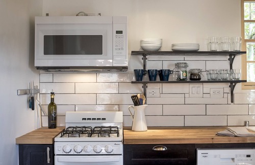Circa 1885 is a beautifully renovated, historic, open-floorplan home in downtown Santa Fe only a few blocks from the City Plaza, Canyon Road, Railyard District, museums, concert halls and the NM State Capitol Building. The home is spacious with 11'-12' high ceilings that welcome in the beautiful Santa Fe light, a modern full kitchen with dishwasher and gas range, a kiva instant on gas fireplace for cozy evenings and a private portal (porch) for sunny afternoons. The massive center adobe wall that divides the living space from the bedroom and bath was lovingly saved, reinforced and plastered as a sculptural homage to the home's legacy. Furnishings include a 19th Century Austrian Walnut wardrobe, luxurious solid wood four poster queen bed, an antique marble-topped vanity retrofitted with a vessel sink, Mitchell Gold & Bob Williams love seat and original lithographs from the 2019 Student Portfolio of UNM's prestigious Tamarind Institute. Immerse yourself in Santa Fe's rich heritage by making "Circa 1885" your home-base in Santa Fe.