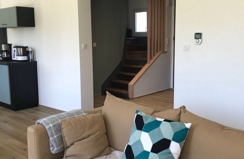 - Bright living room with a lounge area, wood stove (wood not provided, available for purchase at the garden center next to the house).