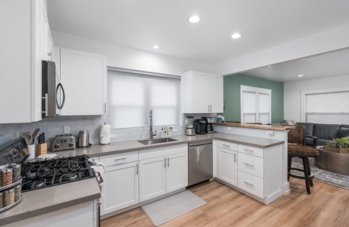 Newly renovated in 2022, this stylish 2-bedroom, 2-bath home blends modern comfort with prime convenience. Enjoy brand-new flooring, cabinets, appliances, and energy-efficient blinds. Each bedroom has a king bed and TV, plus a queen-size convertible couch and stocked kitchen. Located in the heart of vibrant Midtown Reno, you’re steps from trendy restaurants, bars, museums, and downtown attractions. Just minutes from Reno-Tahoe Airport, hospitals, and 45 minutes to Lake Tahoe Adventures!
