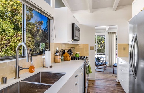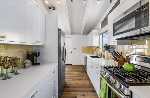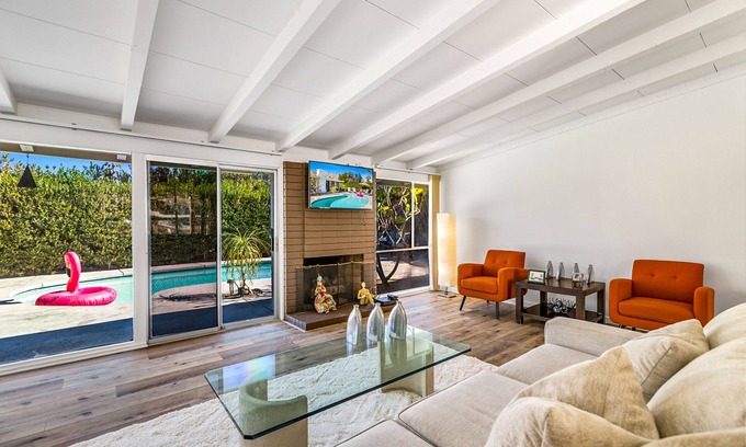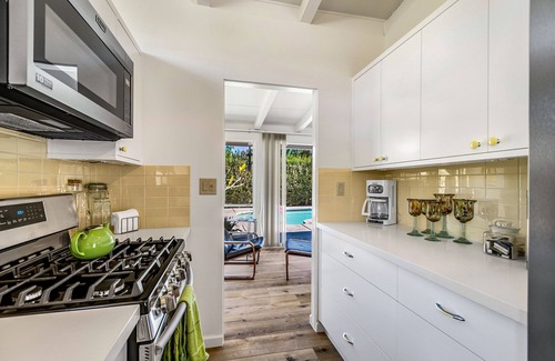 Escape to Rancho Mirage at this mid-century modern vacation rental—perfect for that well-deserved family getaway! Completely remodeled in March of 2023, this home boasts elegance and upscale modern living. Showcasing high ceilings and a sunny, airy interior, this home features an open-concept living area with lots of windows and a large TV, a well-equipped, full kitchen with stainless steel appliances, and an elegant dining area. In addition to two bedrooms, a den houses a queen futon for extra sleeping space. Step through the sliding glass doors and out to your oasis backyard complete with a sparkling, heated pool, gas firepit, and a lovely seating area perfect for relaxing with your favorite reading material or dining al fresco with the help of the gas grill. Additional conveniences include a washer/dryer, while central air-conditioning and heating ensure everyone stays comfortable during their visit.