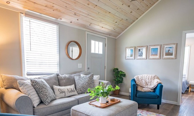 The living room's cozy couch converts into a queen-sized bed for additional sleeping space, and entertainment is a breeze with the Roku Smart TV.