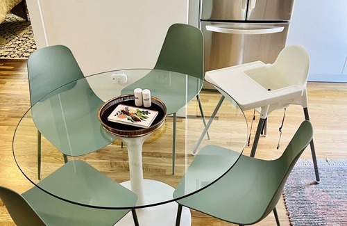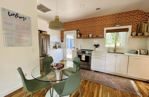 This two bedroom, two bath has been fully renovated with a stylish, modern flair. New heating and AC installed last year. Each of the two bedrooms has a cozy queen bed, with the master bedroom boasting it's own spacious ensuite. The kitchen is fully-equipped with dishes, cookware and spices. The backyard is fenced for your own privacy and pets. Sit under the pergola with your morning coffee and look out over the pristine garden, or bbq your favorite dinner on the patio.
