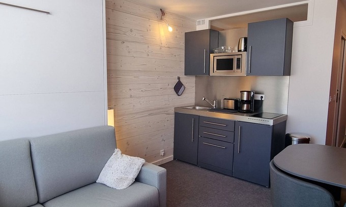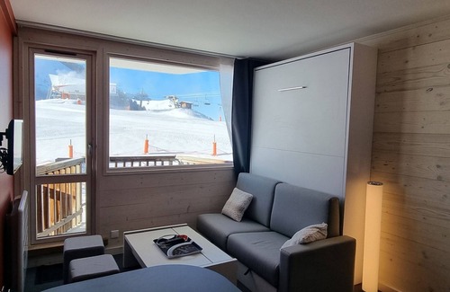 This studio is located on level I of le Paquebot des Neiges and is accessible by the elevator "Diamant". It consists of a kitchen open to the living room, a bathroom and a separate toilet. Its South-facing balcony offers a nice view on the slopes of Aime 2000.