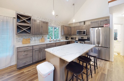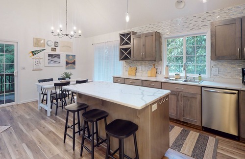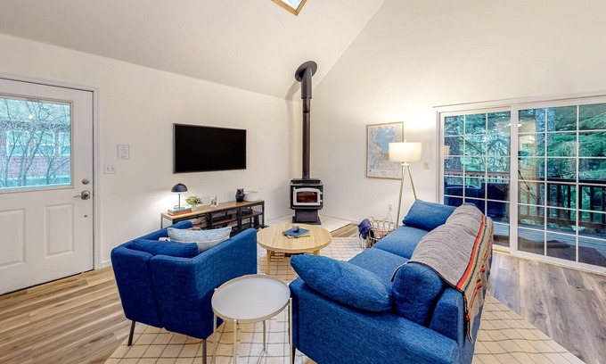 Step inside this three-story vacation rental with a treehouse feel and discover a sunlit, main-level great room with soaring ceilings, skylights, and comfortable furnishings for easy entertaining. Prepare everything from your morning coffee to full-course dinners in the well-equipped island kitchen complete with an array of stainless steel appliances. Dine together at the nearby table or break out a few of the provided board games on rainy days. This open space continues with an inviting living area with cozy seating, a large TV, DVD player and media library, and a turntable ready to spin your favorite vinyl records or sync with your Bluetooth device to fill your home with your favorite tunes.