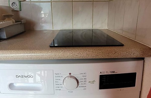 - a kitchenette equipped with cupboards, 2 hotplates, refrigerator table top, washing machine, mini oven and microwave