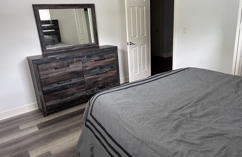 Private room with queen, bed dresser, and nightstand. Amenities include lanai with a pool, kitchen, living room, TV room, dining room, grill, driveway, and on street parking. Sheets and towels included.