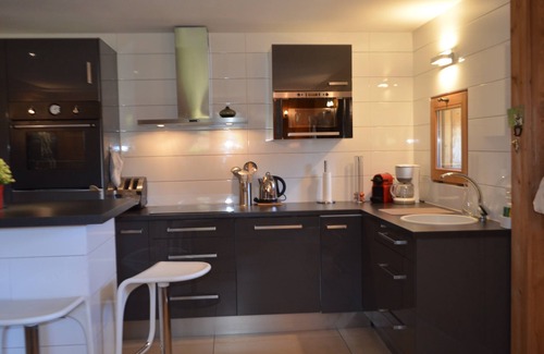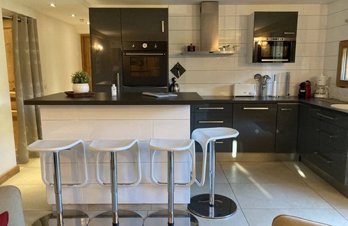 Apartment 60m2 facing the Mt Blanc - dining-room - american kitchen - lounge - 2 bedrooms one very large with bed 160 and one other with 2superposed beds 90 - large bathroom with washing machine - toilets- wifi free- and tv in all rooms.
