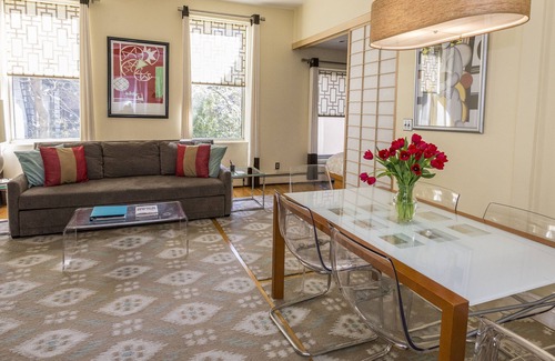 Welcome to Sol Apartment, the 2nd floor private unit within East Village Apartments, a professionally managed historic brownstone in the heart of the most vibrant area of Manhattan. If you are looking for a spacious and well designed home and a centrally located apartment for your family or friends New York City vacation, look no further. Sol apartment is a modern and elegant 1,100-square-foot, convertible two-bedroom apartment in an authentic New York Townhouse and in a Historic neighborhood. Sunshine filters through the tall windows creating a warm and restful retreat. High ceilings, exposed brick walls, and oak flooring lend the space charm. From the oversized windows in the living room with exquisite Japanese sliding doors, you gaze out at the serene Zen garden below.