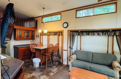 Located in a secluded cove, relax with a fully-equipped cabin and large deck. Queen bed with double loft for lots of floor sleeping area and a queen sofa sleeper.