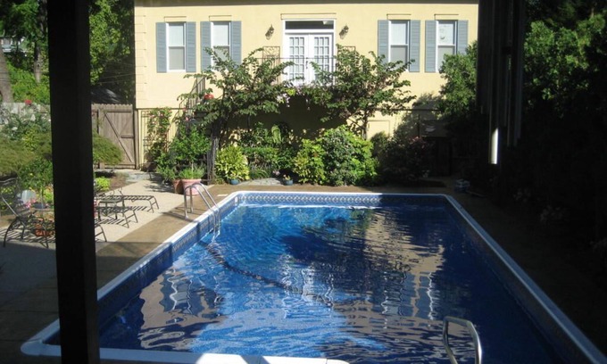 This 950 sq foot, loft-style carriage house, with 17 foot ceilings, is fully furnished with kitchen, bath, washer/dryer, ventless gas fireplace, cable TV, wireless internet, and 2 double closets. The deck overlooks a landscaped yard with swimming pool (During Summer, guests are free to use the pool). One garage bay in 3 car garage is reserved for the tenant and ALL UTILITIES, INCLUDING CABLE, WIFI and SECURITY SYSTEM are included in rent, as well as ALL LINENS.
