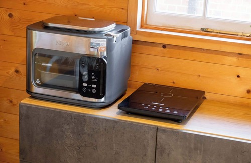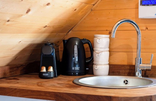 The kitchenette is equipped with the versatile Ninja Combi 12-in-1 Multi-Cooker, Oven & Air Fryer—ideal for saving space without compromising your home-cooked meals. Watch the sunrise over the reservoir while enjoying an espresso from the De’Longhi Essenza coffee machine.