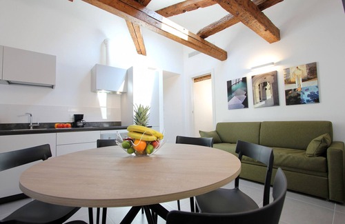 Residence composed of three distinct apartments located in the Historic Centre of Venice, 10 minutes walking from the Rialto Bridge and 15 from St. Mark's Square. Each apartment has a complete kitchen, living room with sofa bed and dining room, two double bedrooms and a bathroom for a total of 12 sleeping places. Upon request 6 additional sleeping places (sofa bed). Maximum capacity 18 people. Residence with high-level modern finishes. Check-in time: 3:00 PM to 8:00 PM. Arrivals between 8:00 PM and 11:00 PM may require a supplement of €50 (to be paid in cash upon arrival)(ID: IT027042B4KJXF6QCA, IT027042B4MFRRZ2JT, IT027042B4AIOF7SK6).