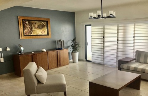 At 10 minutes from Miramar bay by foot and 10 minutes from Guaymas downtown by vehicule, with excelente view to the sea. Near to convinience stores, super markets, cinemas, and more. Beautiful fully equiped kitchen for your comfort. Enjoy the private swimming pool with a bathtub similar to a jacuzzi (not heated) in 1 of its three terraces, or the Tv bar by the pool. It has grill, Wifi internet and air conditioner in all the bedrooms and common areas inside. Its a modern and comfortable house with top quality finishes and decoration that will make you feel like home, ideal for a family or friends vacation.