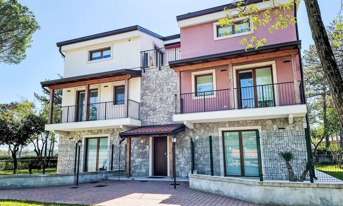 Large, child friendly holiday village "Camping Village Mare Pineta". 115 houses in the resort. 6 apartments in the residence. 1 km from the centre of Sistiana, 18 km from the centre of Trieste, in an elevated position on a slope, 1.6 km from the sea, 1.6 km from the beach. For shared use: property 10 ha (fenced) with trees, swimming pool (30 x 20 m, seasonal availability: 01.Jun. - 30.Sep.). Children's pool, outdoor shower, tennis (extra), table tennis, basketball (extra), beach volleyball, children's playground. In the complex: reception, bistro, shopping facilities, washing machine (for shared use, extra). Grocery 100 m, supermarket 1 km, bus stop 200 m, railway station "Trieste Centrale" 18 km, rocky beach "Baia Sistiana" 1.6 km. Nearby attractions: Castello di Duino 2 km, Castello di Miramare 13 km, Sentiero Rilke 350 m. Please note: entertainment in the season. Suitable for families. Obligation to wear bathing caps. Guests are obligated to wear a wristband in the holiday village. From 14.10.2024-17.04.2025 and 13.10.2025-31.03.2026 only the apartments will be availabe. All the facilites will be closed.