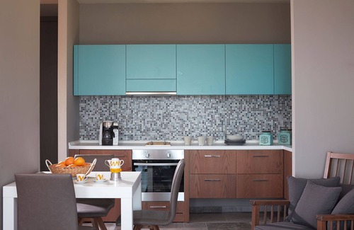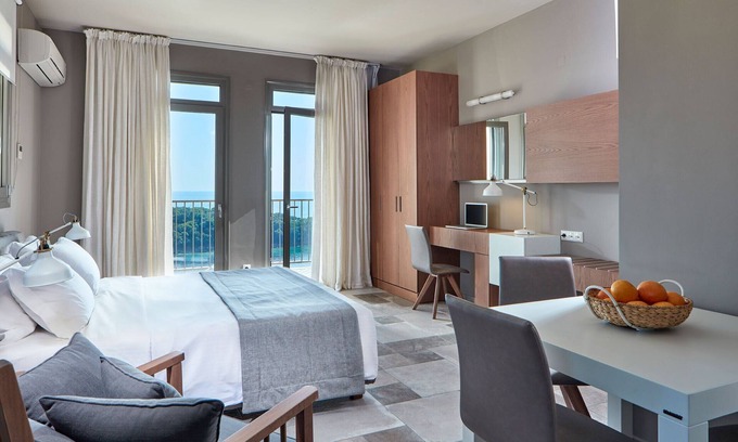 Single spacious space with living room, fully equipped kitchen, dining area, double bed, bathroom and a balcony with sea view. Bathroom with Shower, Hairdryer, Bath Amenities, Bathrobe & Slippers, Fully Equipped Kitchen, Oven and Oven top, Kitchenware, Coffee Facilities, Modern Furnishing, Living Room, Dining Area, Individually Controlled Air Condition, Television (Flat), Wi-Fi Internet Access (Free of charge), Sea View, COCO-MAT beds.