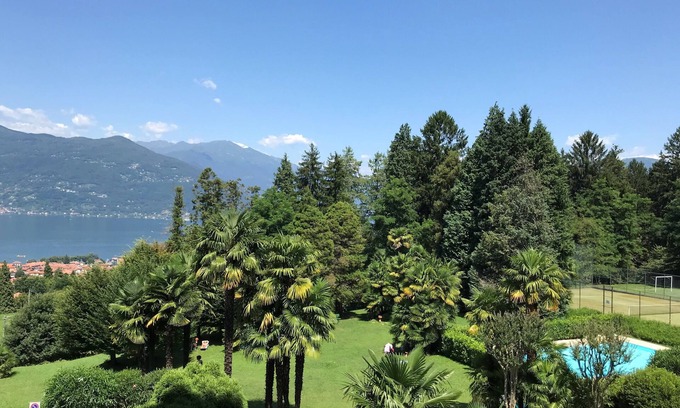 Very quiet apartment in a residence at the 2nd floor with large terrace overlooking the lake in the shade, ideal for dining in front of a wonderful view. Fully equipped, american-coffee maker. Beautiful park planted with large private pool. Tennis court and basketball. Children's Playground. Ping-pong covered. Private wide parking. Nearby town center of Luino with shops, restaurants and various attractions and intertainements. Typical market every Wednesday.