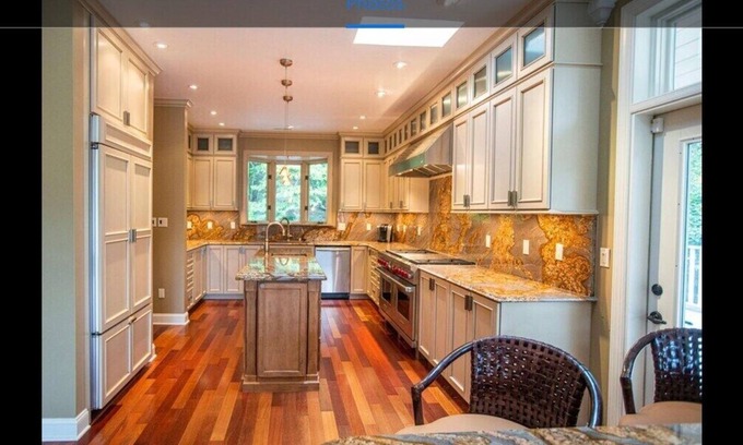 The open living room has Brazilian cherry hardwood floors and boasts a comfortable area for guests to gather, relax and enjoy the wood burning fireplace and watch your favorite shows on the 55” smart tv which includes basic cable (streaming requires you to log into your own accounts) the living room leads out to an expansive balcony. Off of the living room, there is a gourmet kitchen that features a 60” Wolfe stove, an ice maker, coffee maker, blender, toaster, and exotic granite.