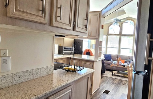 Descriptions such as "spacious yard," "private," and "large lot" are relative to the standard resort site sizes. Our lot is one of the larger, more private corner lots in the resort, offering more space & privacy than typical sites.