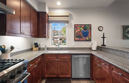 If relaxation closer to home is what you’re looking for, imagine the slow wandering under the bougainvillea-covered gardens, past the fountains, before returning to your villa to enjoy a glass of wine. Watch another famous La Quinta evening come to a close as the sun sets behind the Santa Rosa Mountains seemingly close enough to touch. From the front gate to the front door, expect to feel the warmth of the sun and the beautiful resort surroundings. Once inside, the living area and kitchen are open and inviting for hosting those family memories you’ve been wanting to create. The beamed ceiling living room features a gas fireplace perfect for those crisp desert nights and a large smart television perfect for snuggling in front of the fire and watching your favorite films. The dining room and bar area has seating for 6, perfect for those family or friend get-togethers. If you want to take the fun outside, the french doors off the dining room open up to a large garden patio with mountain views that will make any meal outdoors magical. The bedroom offers the plush king bed perfect for rest and a restart for another day of fun in Southern California. There is a full-size washer/dryer located in the hallway for your convenience. Fast wifi and comfy work surfaces make Villa Palmera the perfect location for resort living, remote work and family fun.