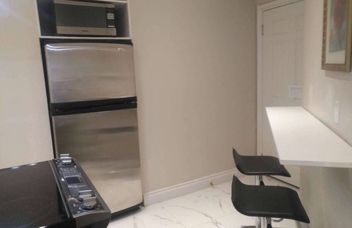 he private kitchen has a refrigerator, a stove, a microwave, a oven and other kitchen supplies.