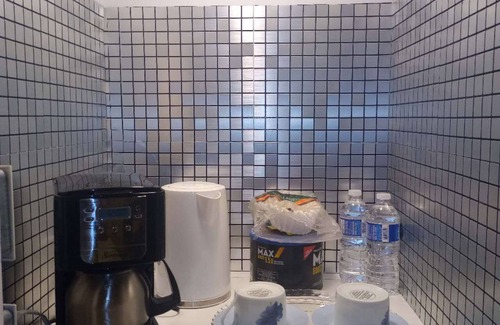 Guests have access to a private dining area in the backyard. as well as a fire pit, charcoal grill, and firewood. By removing the tabletop and placing the grill, you can sit around the fire pit to barbecue while keeping warm. Use of the fire pit requires an additional fee of $50.