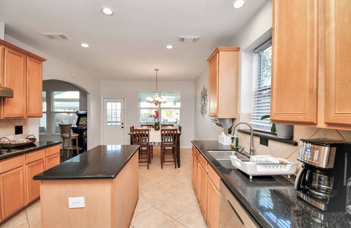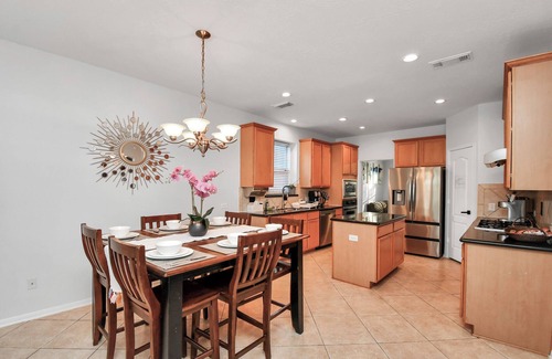 Elevate your vacation experience with this huge 5 bedroom 3.5 bathroom house. Boosting over 3253 square feet of living space. This house comes with a heated swimming pool, spa, outdoor kitchen, and huge covered patio for maximum entertainment. The master bedroom is conveniently located downstairs. The 4 bedrooms upstairs are separated by bathrooms. Plenty of room for everyone to spread out. There's Air Hockey Table, Arcades, XBox and PlayStation System to keep you entertain. No backyard neighbors for extra privacy.